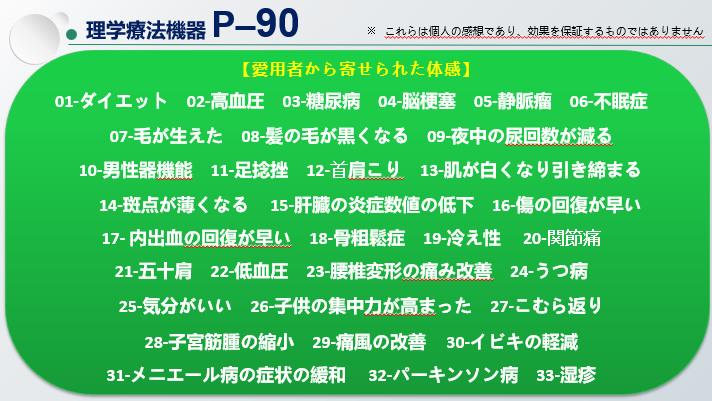 人には生体電流が流れており、この電流が心臓、脳、筋肉など体のあらゆる組織に作用。P-90は有益な”電磁周波数”を細胞に提供し、ストレスや病気などで低下した生体電流が回復。