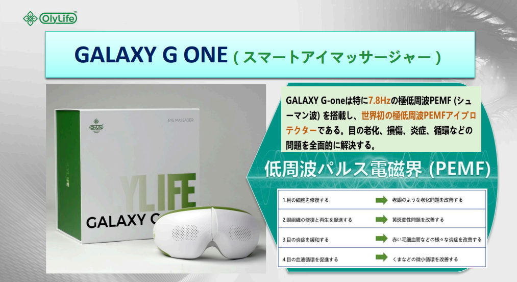 GALAXY G-oneはアイケアのあらゆる側面を向上させるように設計された低周波PEMFテクノロジー搭載のホットアイマッサージャーです。