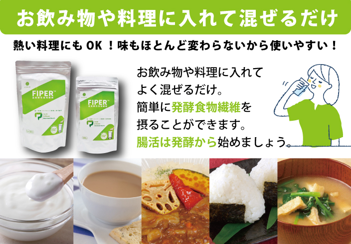 FIPER™は使い方もとっても簡単!普段飲むお水やお茶、珈琲に5g程度入れてよく混ぜるだけ。また熱い料理に使っても働きは変わらないためカレーやシチュー、煮物やお味噌汁を作るときに入れて混ぜるだけで家族みんなで発酵食物繊維を摂ることができます。もちろん、ヨーグルトや納豆などの乳酸菌を含む食品と一緒に摂るのもお勧めです。