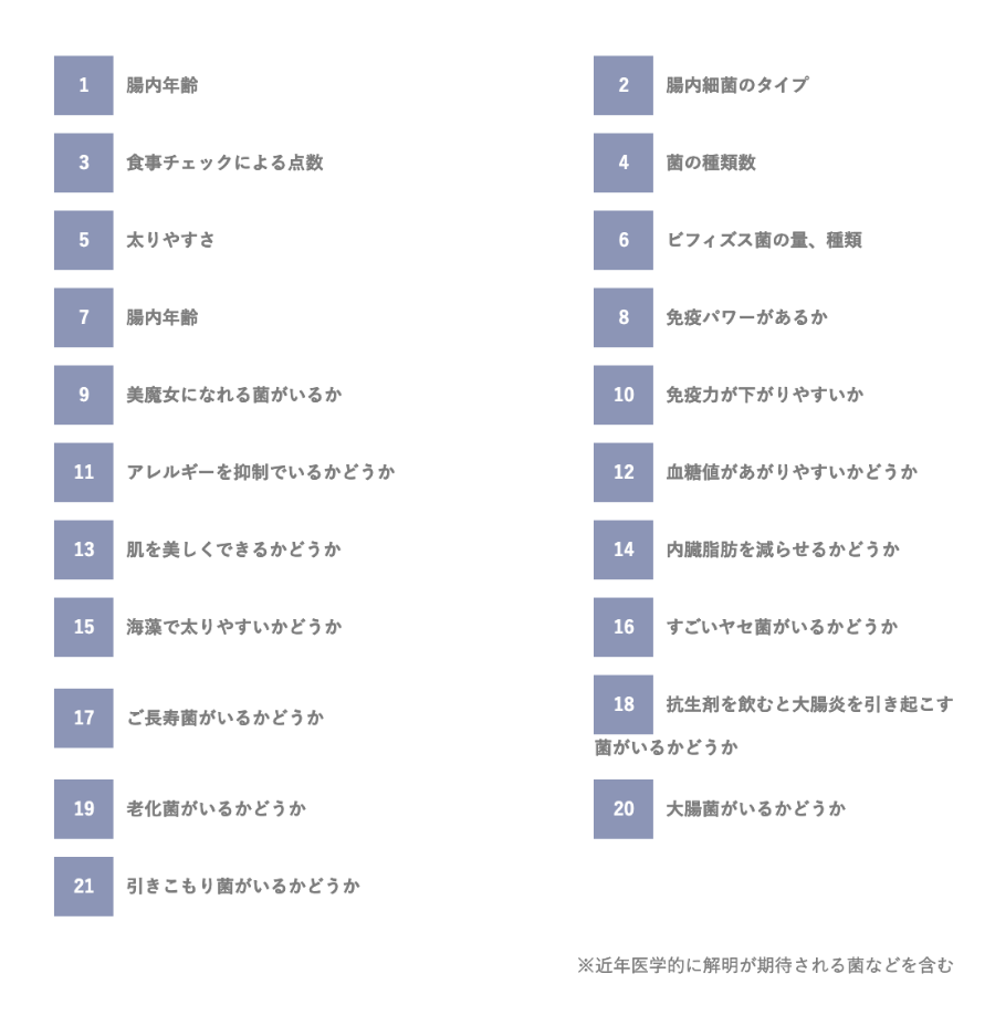 腸内細菌の種類・バランス・多様性などを読み解き、目標達成に最適な食事、栄養、サプリメントなどのご提案ができます。