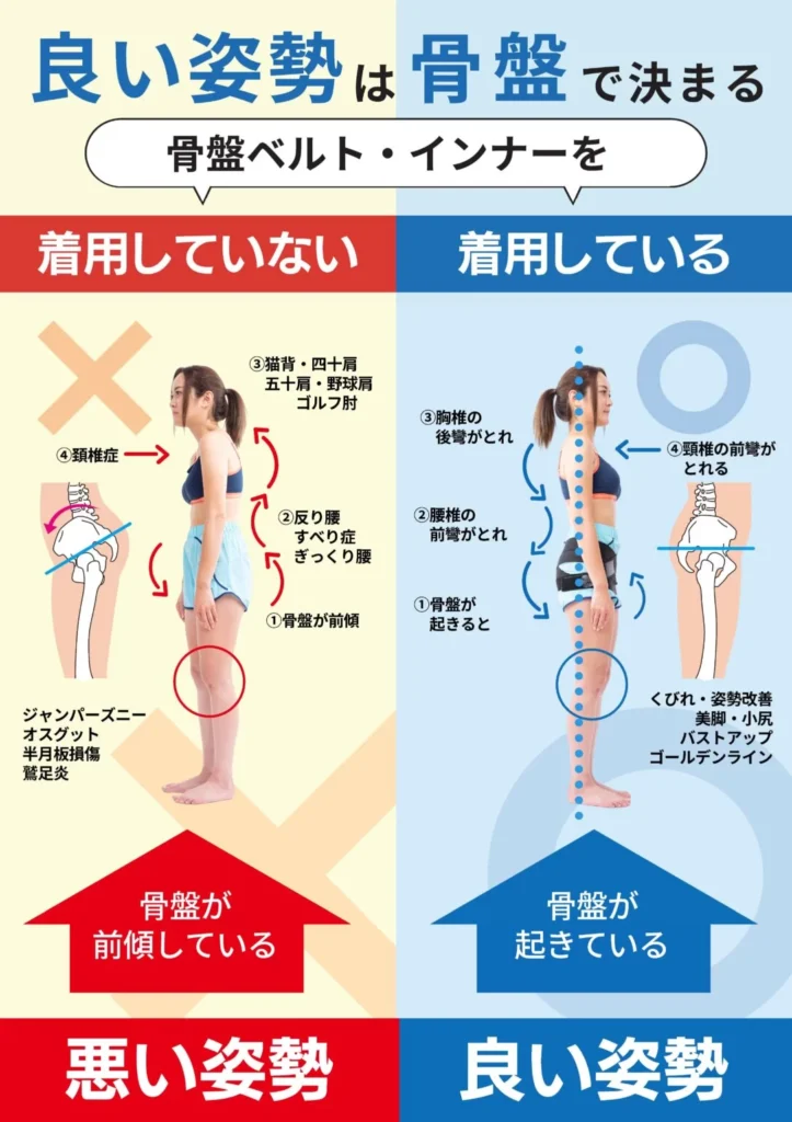 従来のただ締めるベルトではなく、骨盤の前傾をニュートラルポジションへ導くことで身体の本来の機能性を取り戻すことができます。