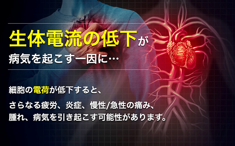 人には生体電流が流れており、この電流が心臓、脳、筋肉など体のあらゆる組織に作用。P-90は有益な”電磁周波数”を細胞に提供し、ストレスや病気などで低下した生体電流が回復。